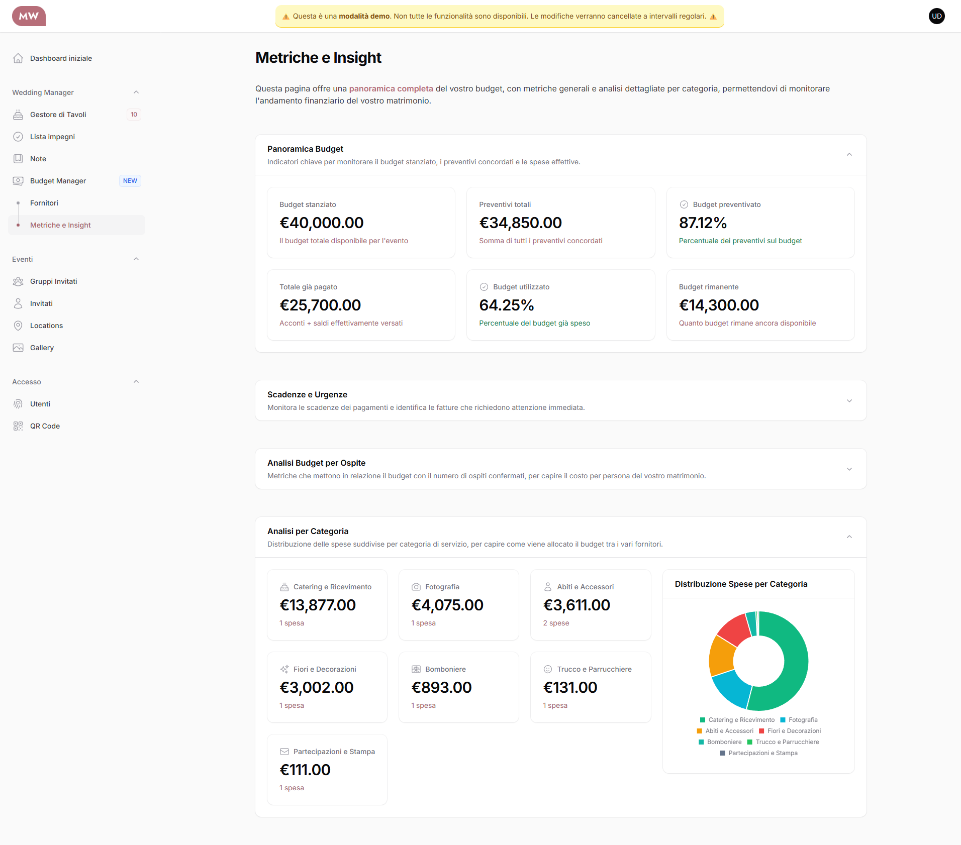 - È stata introdotta la nuova sezione Metriche & Insight, una dashboard pensata per andare oltre al semplice “Ho speso X”. Qui puoi capire davvero dove stai andando, quanto manca e quali rischi potresti correre. Troverai visualizzazioni chiare dei dati panoramici, un tracker per scadenze e urgenze, un’analisi dedicata al budget per ospite e una suddivisione completa per categoria.